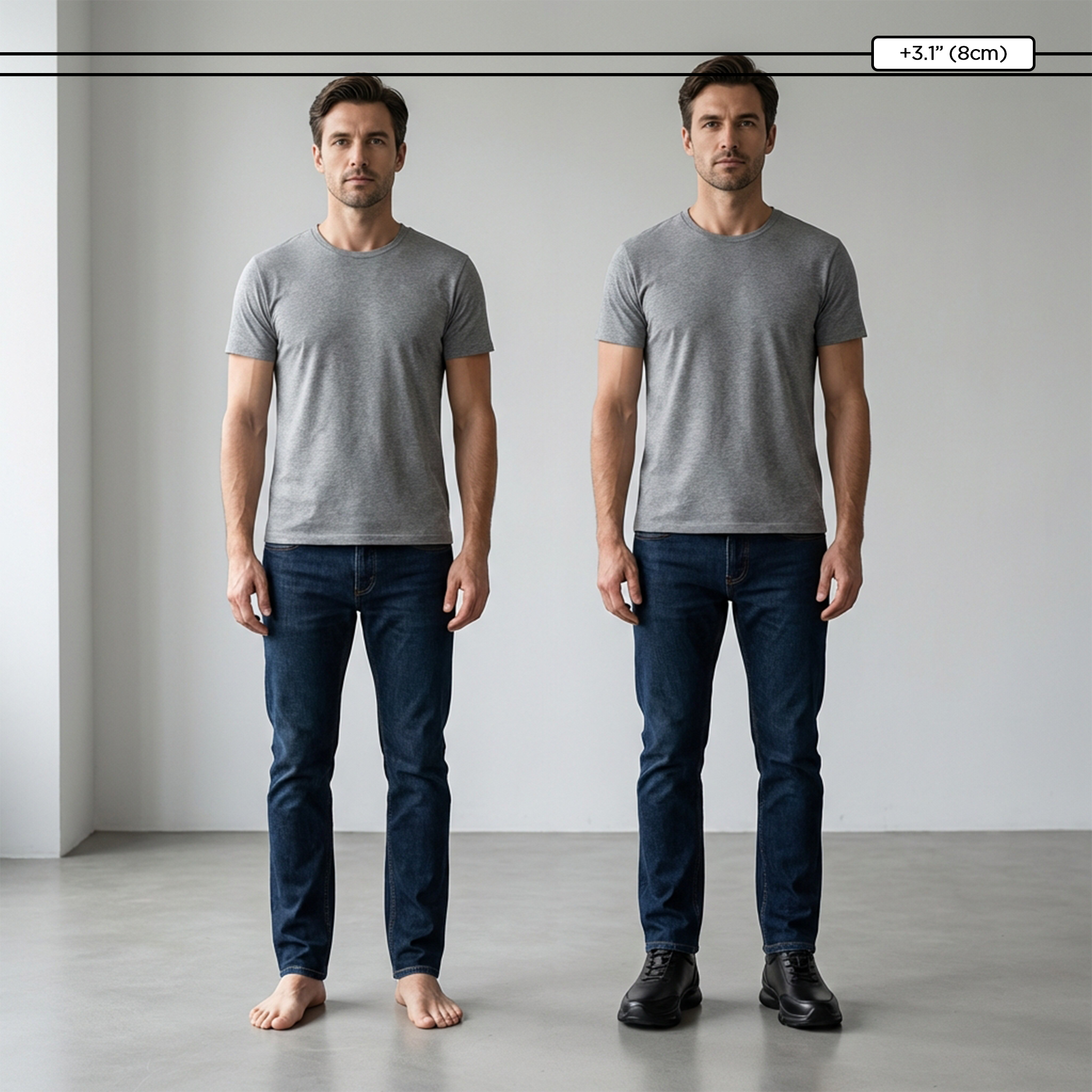 Profitez d'un gain de taille discret allant jusqu'à 8 cm . Ce gain est totalement invisible : vous seul le remarquerez .