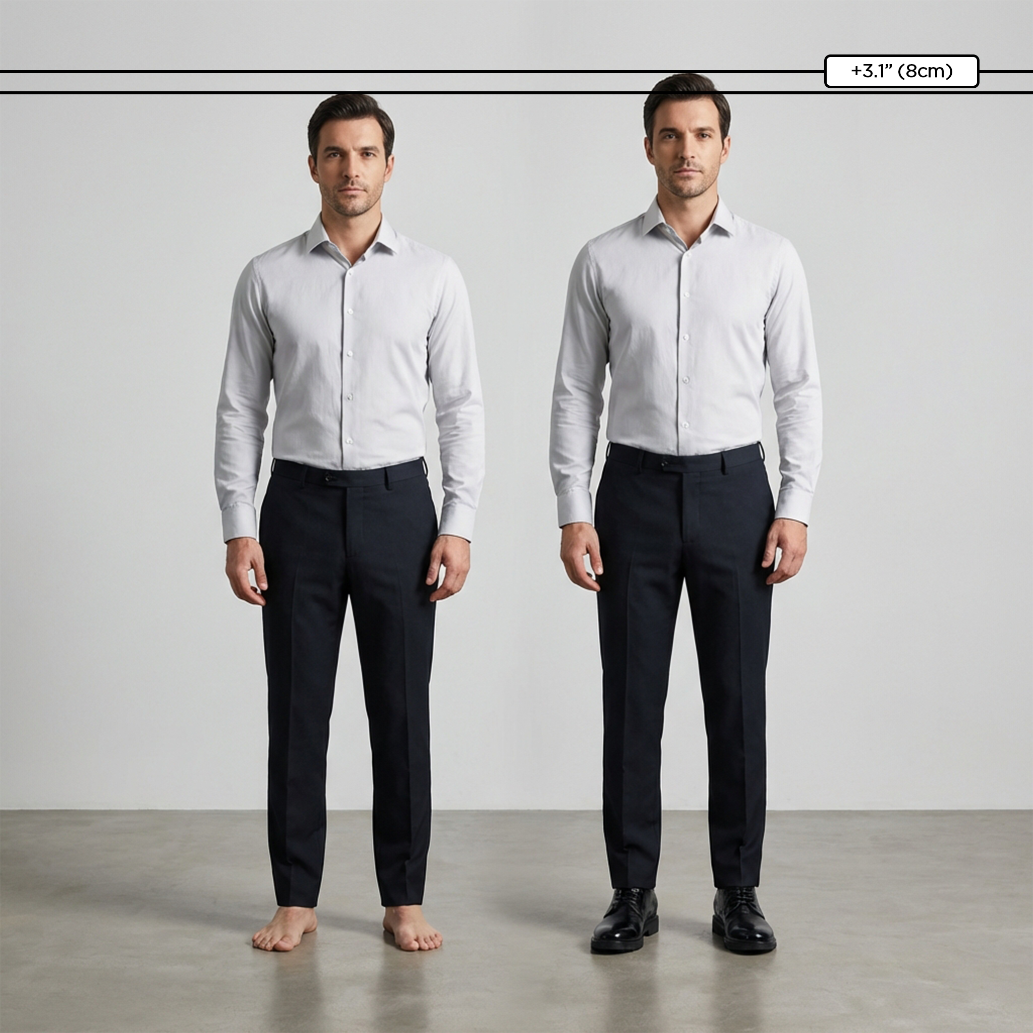 - Rehausse de taille : 6–8 cm intégrés discrètement dans la chaussure