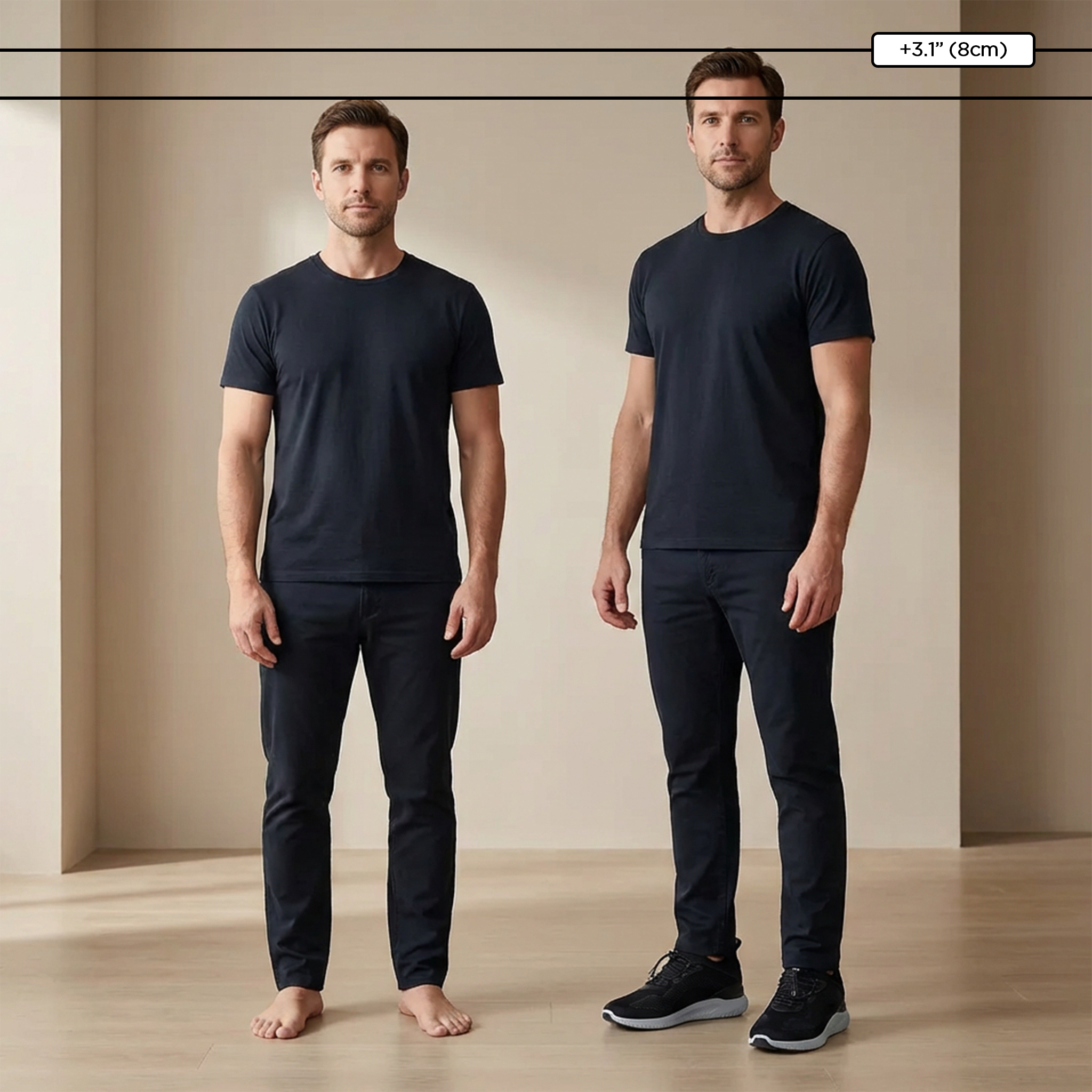 Profitez d'un gain de taille discret allant jusqu'à 8 cm . Ce gain est totalement invisible : vous seul le remarquerez .